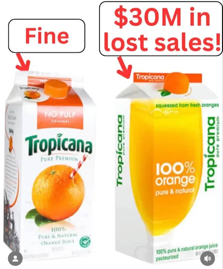 This was a cool graphic showing Tropicana’s sales went DOWN after swapping their iconic orange-with-a-straw image for a plain glass of juice:
