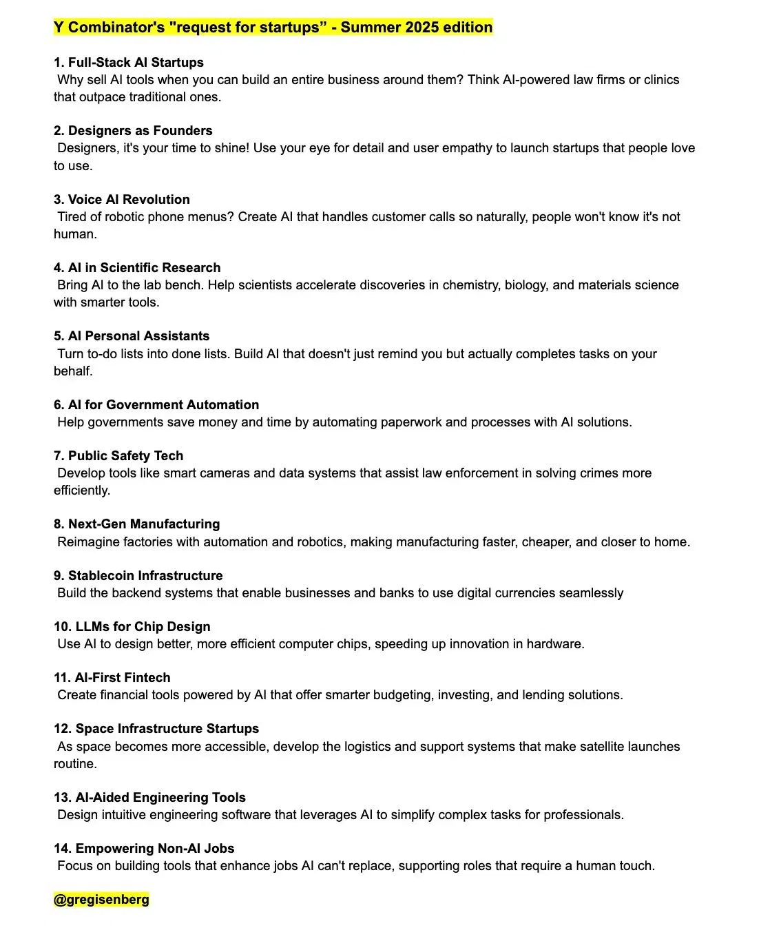 This is a list from Y Combinator showing startups they want to invest in the summer of 2025: