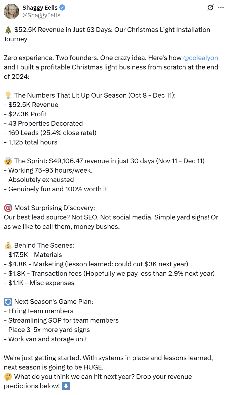 I'm following along as Shaggy posts trying to get $100,000 in Christmas Lights installations in the next 3 months.